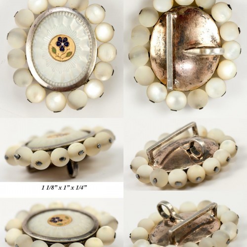 I’ve added a final image to show you what this gorgeous little item is. It is half of a 2-piece buckle which would have been used in the Empire gowns of Napoleon & Josephine’s era. I’ve had a few of these, and we have an entire 2-piece buckle listed separately. The interesting thing about these little gems, apart from their very advance age and opulent beauty, is that they are from the boutiques of the famed Palais Royal, Paris. The old Palace of Cardinal Richelieu, just a short distance from the Louvre, the Palais Royal was center of elite society’s entertainment, commerce for a century and a half, and the boutiques that lined the promenade offered up the most splendid of treasures to its patrons. These buckles among them. Now they’re popular as a pendant (see backside) and are fabulous enhancers for your pearls, as well. This one is beautifully made of fine old mother of pearl. Photos tell all.