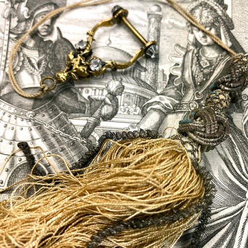 Very good condition for age and type. Measurements noted on the photos. No missing stones, the ring has no dents. The passementerie shows age but is complete, lush.