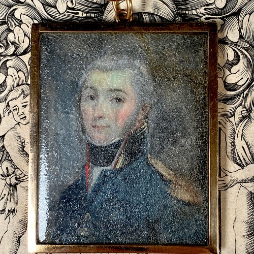 Very good to excellent condition on the painting and its 18k gold locket-style frame with rings and bale up top. Not so good condition for the old glass. Both front and back cover glass, original to the painting, are slightly convex and have no chips nor cracks, but they have surface deterioration often referred to as ‘sick’ glass. Yes, you can see the painting through it, but it catches light and defies a good photograph for that reason. I’ve seen others with this problem, and but for the 18k gold frame and the handsome military officer, I’d have passed it by. Our price considers the imperfection.