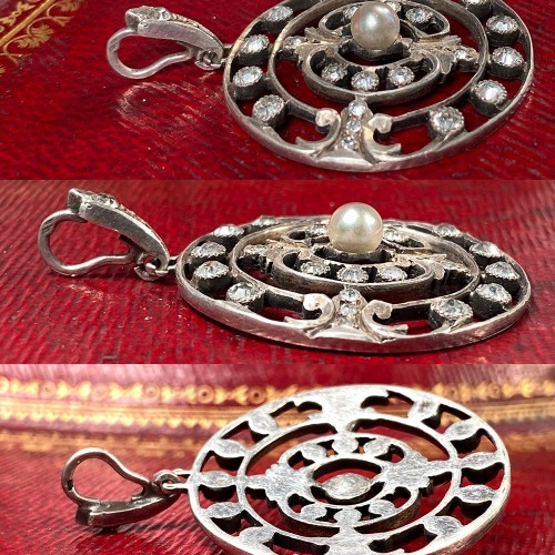 The age and quality of this elegantly crafted 19th century French pendant has exceptional cut stones, to the point I did test them – they’re not sapphire, but might be natural crystal, the cuts and facet are crisp and without rounding like often happens with the old French paste stones. The 4mm pearl is top quality, and it is obviously a bespoke jewelry item. The silversmith’s diamond-shaped punch mark can be seen, but is too small for me to capture for identification. The boar’s head profile can be read, however, and it is made of .800/1000 silver, which the French used often for diamonds, too, 18th century onward. They do not look right for paste stones, however. The facets are too crisp, and I feel certain it is a much harder ‘stone’. Old mine cut, the piece dates c.1850-70, Napoleon III. Stones capture so much light!