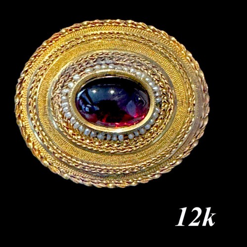 A rare and superb 18th century to very earliest 19th century French Palais Royal aide de memoire, notepad cover, carnet du bal with 2 glorious panels of carved mother of pearl set into gilt ormolu framework that is trimmed with cabochons of Persian turquoise (some missing), and of course set both front and back with the small 18k gold oval medallion and its signature kiln-fired enamel flower – symbol of many fine items sold in 18th to early 19th century boutiques of the famed Palais Royal, former palace of Cardinal Richelieu. Best of best objects, accoutrement, home and voyage goods, much sought after still today. This one is thick at 1/2″ with a solid hinged spine, and ringed closure into which a stylus or pencil inserts to act as its closure. While the old notepad and card case or holder that original was inside has not lasted the years, it would be simple to make one to fit and actually use this one, a little necessaire. Measurements shown on photos.