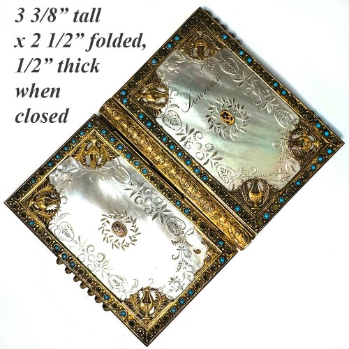 Very good to excellent condition for age and type, you’ll note a flaw is that it’s missing some of the turquoise jewel cabochons both front and back. The jeweled ones are rare, and one might want to either replace the front missing ones with those still on backside, or to locate replacements in jewelry making supply resources and fill all the spots missing theirs. These are Persian turquoise. There is another flaw on the back side, where one Empire corner ornament has gone missing. Otherwise, very lovely and ormolu retains high gold surface even without any polish. No damage at all to either of the elegantly incised mother of pearl panels, which are high-pearlescent shimmering jewelry-like on their own account. A beauty!