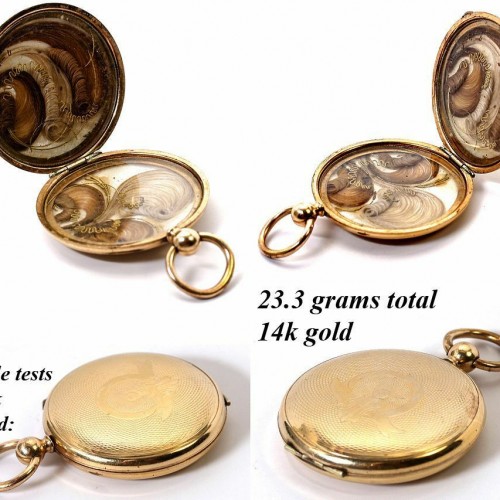 Acid tested at high 14k gold, likely 15k for the age of it, yet without any hallmark, it might be a very thick 14k + layer I can’t scratch through. this larger locket pendant is made in pocket watch size and form, large bale up top and might well have been a gentleman’s item, worn on a watch fob chain & tucked in his vest, brought out and cherished along with the memories of the loved one whose hair is so beautifully arranged within. The custom of saving locks of hair of someone you’d loved goes back a very long time, but was elevated in the Georgian to Victorian era to a high fine art of jewelry making, and we find many exquisite examples of goods that still house the decorative hair ornament within. Remember, there were no photos, painted miniatures or large portraits were very expensive and reserved only for the very wealthy, the few. This large locket has 2 sides, and the old early original arrangements of hair from 2 people or perhaps 3 are still almost perfectly arranged within, protected by their undamaged cover glass. The hair within each is arranged in 3 feather-like curls. One can speculate that perhaps they represent 3 children lost to childhood disease, or perhaps a wife and 2 children – death was often early, undaunted by youth or beauty, or wealth. Yes, this one would have been commissioned by someone wealthy. The solid gold, the precious arrangement of the locks, with gold wire trim – it’s a superb piece. You’ll display it when you’re not wearing it on a long gold chain, or a black ribbon of silk or silk velvet, which was often how they were originally worn.