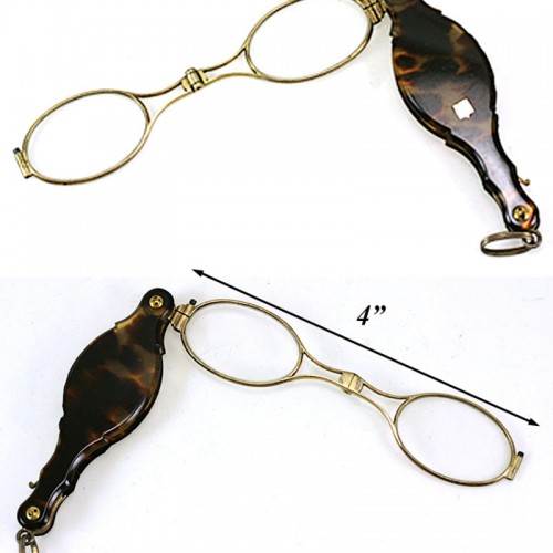 A gorgeous pair, folding reading glasses, lorgnette in very fine form, lenses intact and undamaged, 18k gold cartouche awaits your monogram. The functioning mechanism is smooth and without loss or damage, and the stunning cognac and chocolate tortoise shell housing is without loss or flaw, as ell. Large bale to hang on a gold chain or a velvet ribbon, the set dates c.1850-70. Full measurements noted on the photos.
