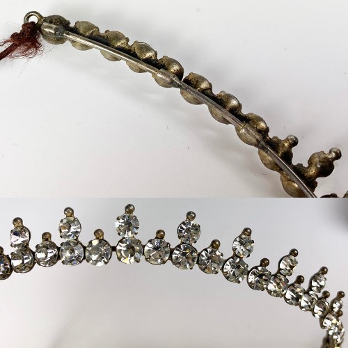 Very good to excellent condition throughout. Beautifully crafted. I’ve tried to show you in our many views, just how lovely and old it is. Dates c. 1850-80. An later elastic has been added, but even it is quite old. Clear, bright – very opulent! Measurements noted on our photos. Larger than the Napoleon era Empire tiaras, which we’ve grouped with it on one of the final photos. Added images show that it has flexibility, adjustable by the tightness of the elastic cording, giving great variations in how it can be worn.
