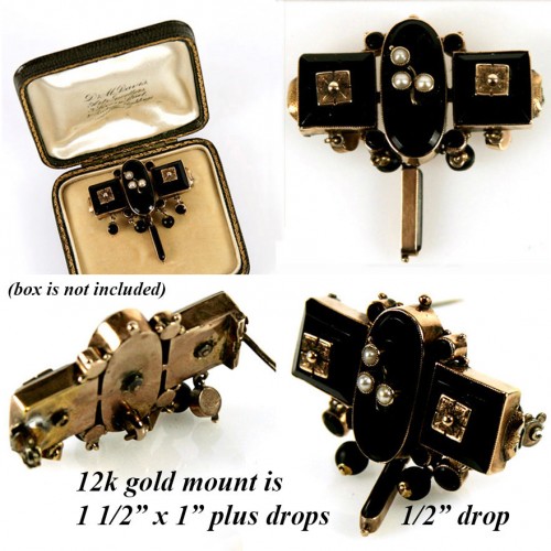 Beautiful, complete, without damage. This is a Victorian era mourning brooch of beveled plaques of jet surmounted with 12k gold set with seed pearls, 12k gold basin and finback, likewise the 5 dangles which hand from the brooch. One of my all-time favorites. Full measurements noted on photos, but it is 1 1/2″ wide. Box is not included.