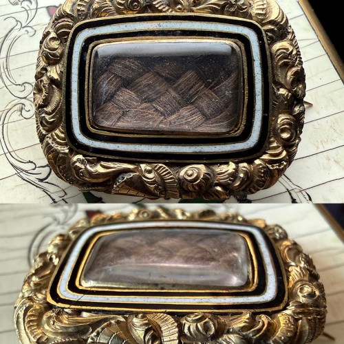 Antique Victorian Era 12k Gold and Enameled Mourning Pin, Brooch with Dark Blond Hair Art