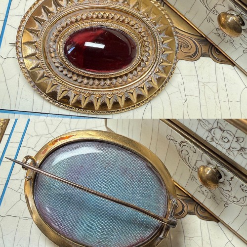 Antique Victorian Era 16k Gold Victorian Brooch, Large Garnet Cabochon, Mourning Locket Back