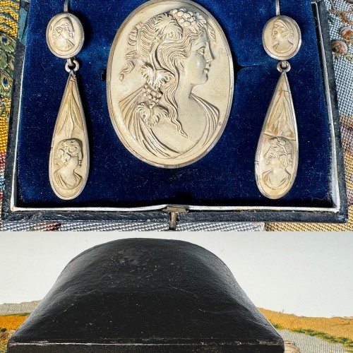 A stunning Victorian era Grand Tour souvenir set, brooch and long dangling earrings in carved lava cameo (5 in all), found in France and still in their original presentation box, case. The parer dates c.1850-70, and while an acid test says 10k on frame of the brooch, the ear wires are only gold plated, possibly replacements. Carved from matched lava, the set is suitable to wear safely or display. Box is included. Full measurements noted on photos. I’ve photographed this against colorful silk embroidery just as a background, and those are not included.