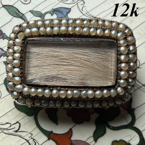 From my own collections of decades: “Alfred Tindall, died 13th May 1847 aged 6 months” – just a baby. No photos, just a lock of very blond baby hair for the family to keep as memento. Antique 12k Gold and seed pearl hair art mourning brooch, c 1847, early Victorian Era. Total weight: 3.55 grams. Double row of fine seed pearls, each representing the tears of the mourner. Thin unbraided pale blond hair inside, and the sad engraving on back. I sometimes use these grouped on a jacket lapel, or clasped over a strand of pearls – so many compliments!