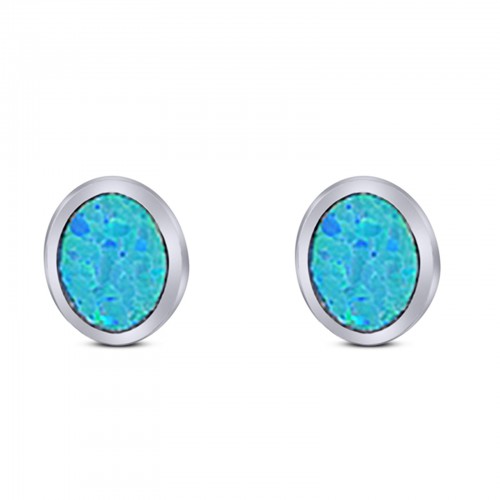 Art Deco Oval Stud Earring Created Blue Opal Solid 925 Sterling Silver (8mm)