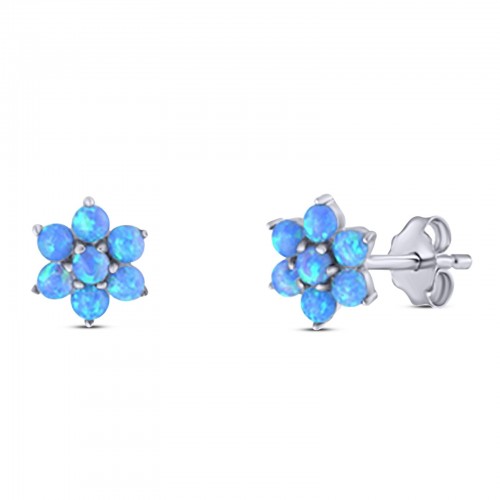 Art Deco Round Flower Design Stud Earring Created Blue Opal Solid 925 Sterling Silver (6.3mm)