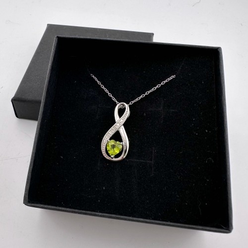 Beautiful and bright heart shaped peridot on edge of sterling Infinity symbol pendant. Sterling silver detailing an very small diamond accent on front.