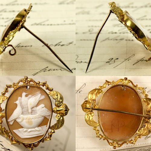 Beautiful Victorian Antique Cameo in 12k Gold Brooch Mount, Subject: Doves of Pliny