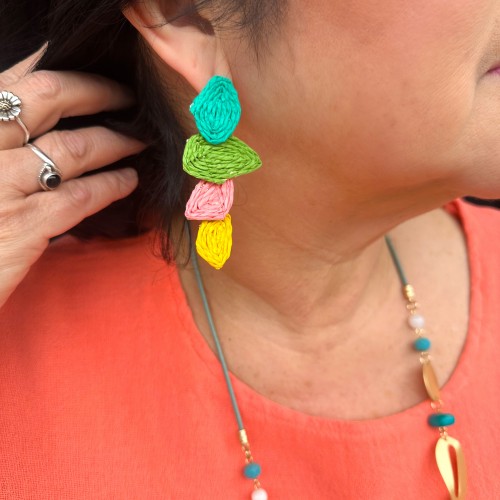 Blue tones make up this fun straw flower necklace.