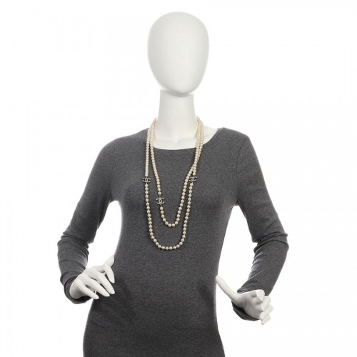 Chanel’s Extra Long 70″ CC Pearl Necklace is a dramatic piece that can be wrapped up to four times! The faux pearls are strung together with three double-sided silver-tone logo stations studded with tiny faux pearls and secures with a lobster clasp. In very good condition, it comes with a pouch and box and is gently worn and a bit perfume-y. This necklace has multiple styling possibilities that can give you a new look limited only by your imagination!