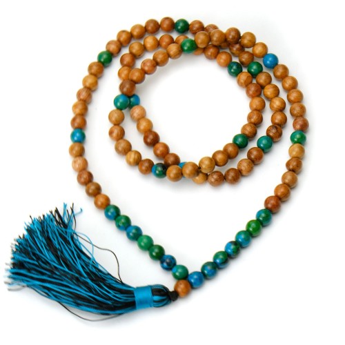 - Chrysocolla and Palmwood 8mm Knotted Mala with Silk Tassel