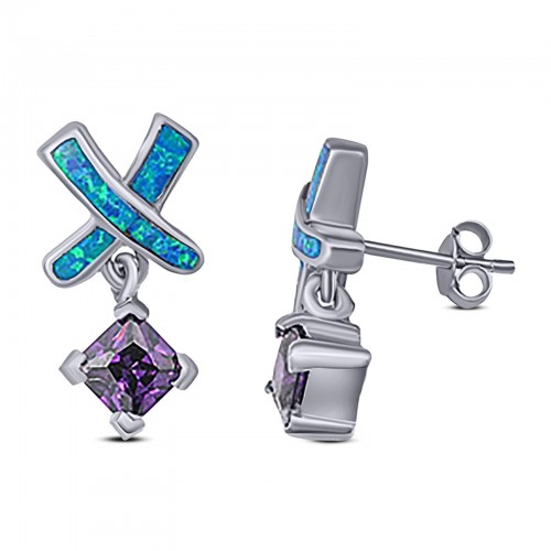 Cross Stud Earring Lab Created Blue Opal Princess Simulated Amethyst CZ 925 Sterling Silver (20mm)