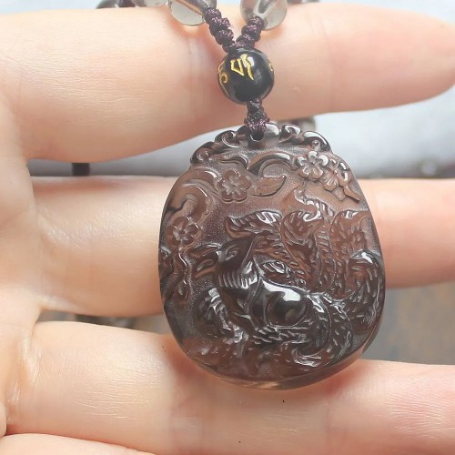 - Crystal Gemstone Natural Ice Obsidian Nine Tail Fox Necklace Pendant with Chain