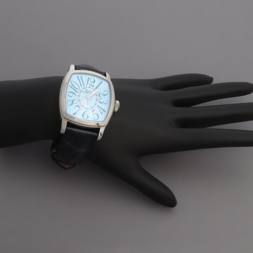 Daniel JeanRichard’s Stainless Steel TV Screen Watch 36mm is a pretty piece with a baby-blue guilloché dial! This Swiss-made automatic has Arabic numeral hour markers and white hands, and the two-piece strap is black alligator with a deployment clasp. Previously loved, it has marks on the metal and strap, and will still keep you on time for the next stop on your journey in life!