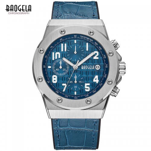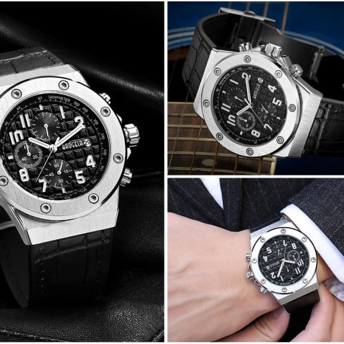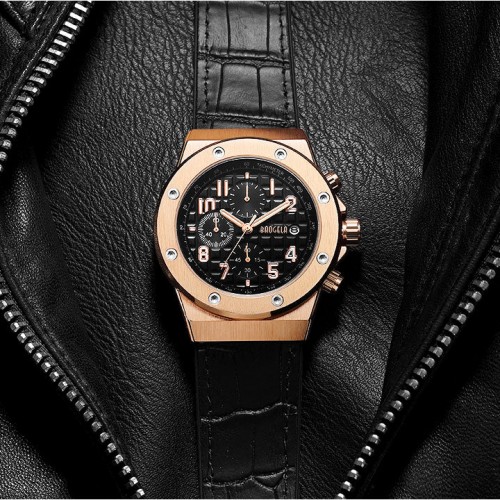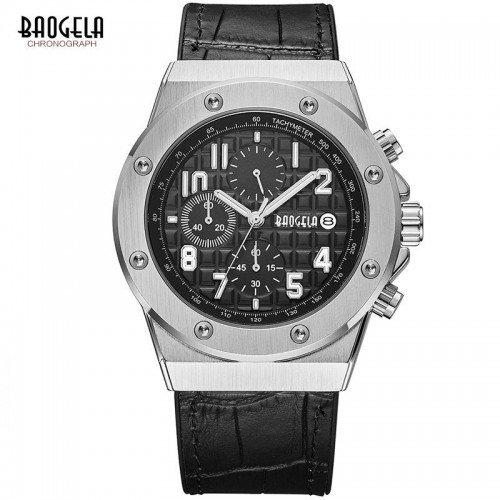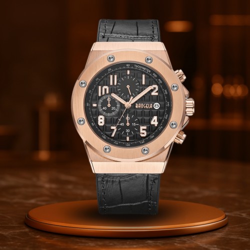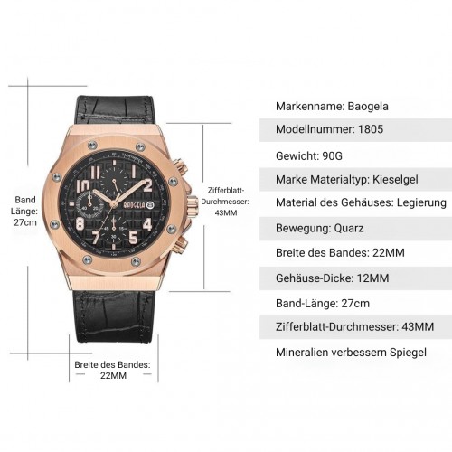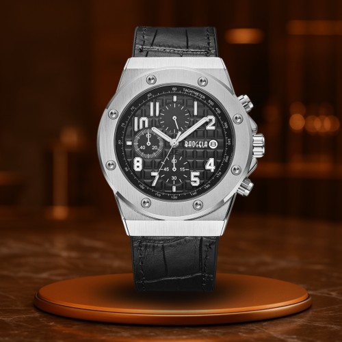 De echte leren band zorgt voor een comfortabele draagervaring met tegelijkertijd een zelfverzekerde uitstraling. Luminieuze wijzers, chronograaffunctie en een betrouwbaar kwartsuurwerk completeren het technische interieur – klaar om elk doel met stijl te bereiken.