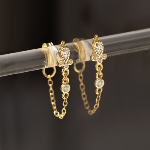 Unique gold deco chain earring studs with a teardrop crystal center and a long chain attached to the backs. Design that looks great alone or paired with other earrings.