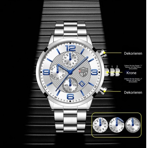 Lichtgevende wijzers en markeringen zorgen ervoor dat je het overzicht hebt in elke situatie – van de presentatie vroeg in de ochtend tot het galafeest in de avond. De ingebouwde kalenderfunctie helpt je de controle te behouden tussen vergaderingen en momenten.