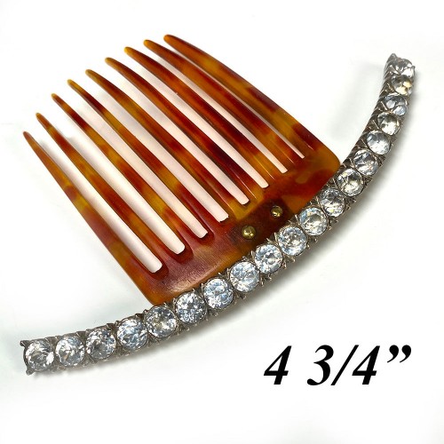 Fabulous large antique French paste stones line the silver bar tiara, each one is 7mm, so it looks like a long row of 1 ct diamonds. They’re that sparkling, which is what the old French paste stones are known for – mimic of diamonds. The perfectly preserved 19th century ornamental hair comb or tiara is nearly 5″ long, a hinged mount to tortoise shell comb allows for a variety of ways to use it – chignon, or crown. Full measurements noted on the photos.