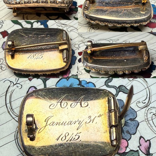 “A. A. January 31st, 1845”, early Victorian era, these mourning or memento pins were so precious and treasured, they often survive in excellent condition as is the case with this one with its 2 framing rows of seed pearls. Can be worn either as a pin or pendant (I’ve often latched these over gold chain or over pearl strand. Really a beautiful one – I’ve clustered these on lapel of a more formal AKRIS black silk velvet tailored jacket before and love that look. I’ve seen them hanging in numbers along a pearl strand which is also a stunning look. Full measurements noted on the photos.