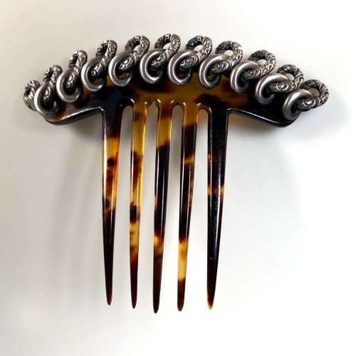 Superb condition and beauty, an ornamental hair comb, Napoleon III era (c.1850-70s) chignon arched tortoise shell comb mounted in intricately worked hollow form silver. Full measurements noted on photos.