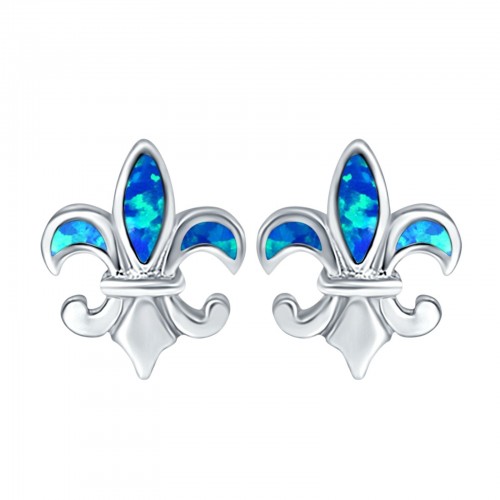 Fleur de lis Stud Earring Lab Created Blue Opal 925 Sterling Silver (16mm)