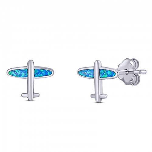 Flying High Aeroplane Stud Earring Created Blue Opal Solid 925 Sterling Silver (8.7mm)