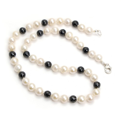 Fresh Water Pearl with Black Spinel Knotted Necklace with Sterling Silver Trigger Clasp