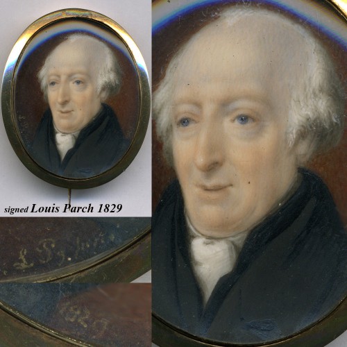 Even before Queen Victoria reigned, this fine distinguished gentleman of a certain age, was captured elegantly by artist “Louis Parch (or Parer?), Brighton, 1829”, the gentleman might be Lt. Soames, Esq. based on the notations on the thin velds still adhered to back of the small painting. I’ve enlarged it so much for your inspection, it loses a little of the crisp clarity of image. Truly an exceptionally fine work of art. Exceptional miniaturist. Appears to have been painted while in Brighton, UK, the beach resort most notable for British society in that early era. The mount is solid and heavy gold, tests at 14k, so may well be 15k or 16k. It does not test at 18k. Measurements noted on the photos.