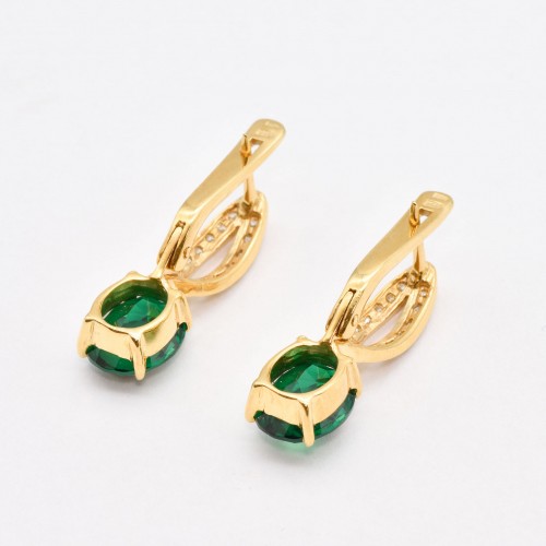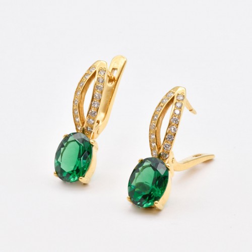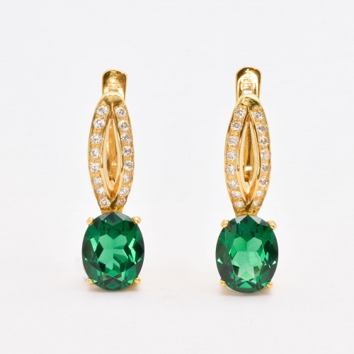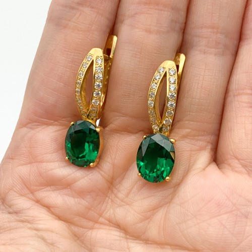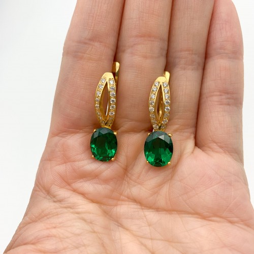 Gold Emerald Earrings set with a Created Emerald in a perfect diamond cut & stunning green color with flawless clarity, at 10x8mm each (6 Cts a pair).