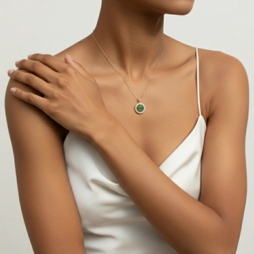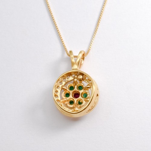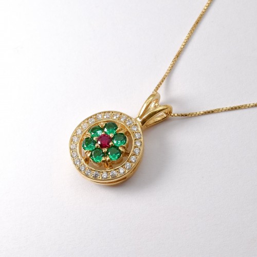 Gold Emerald Pendant set with Created Emeralds in a flawless clarity & stunning bright green color & Created Ruby, at 3mm each, 1 Carat combined, with small CZ Diamonds.