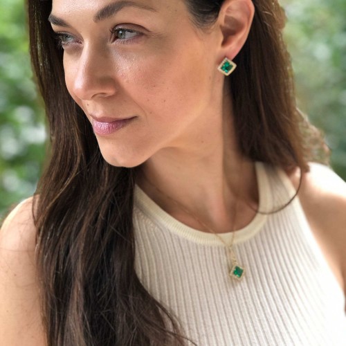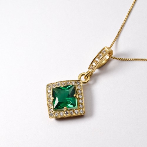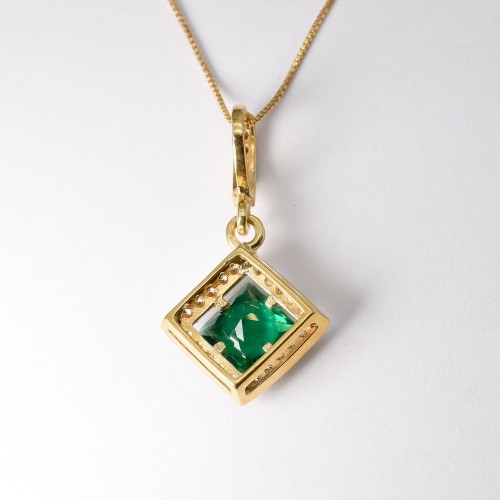 Gold Emerald Pendant set with a Created Emerald in a princess diamond cut, flawless clarity & deep green color, at 10x10mm, 6 Cts.