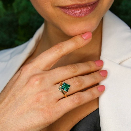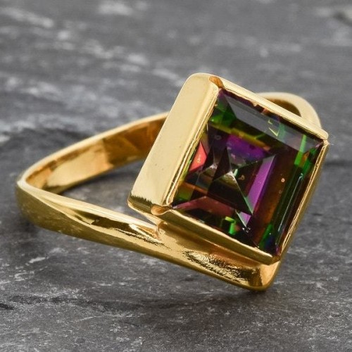 Gold Mystic Topaz Ring set with a Natural Mystic Topaz in a diamond cut, flawless clarity & purple/green color, at 8x8mm size, 3 Carats, from Brazil.