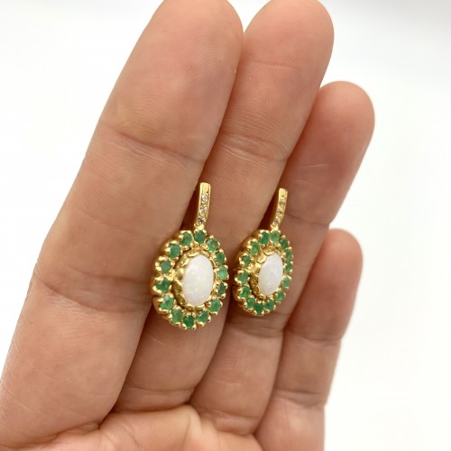 Gold Opal Earrings set with a Natural Australian Opal in a top grade & natural color, at 8x6mm each (4 Cts a pair), from Australia. Surrounded with Natural Emerald, at 2mm each from Colombia.