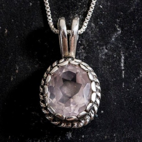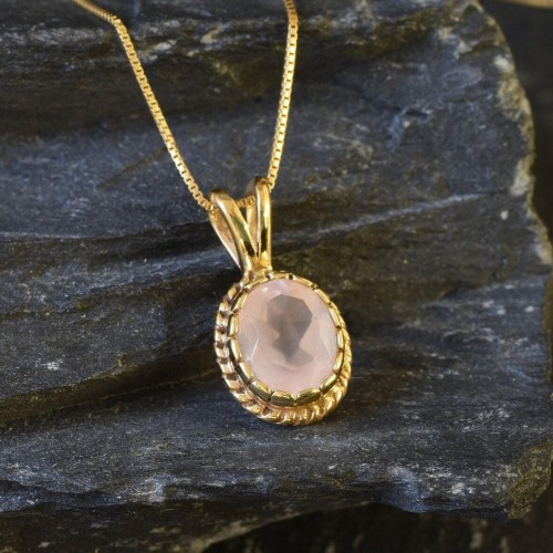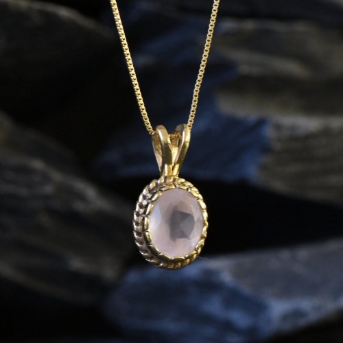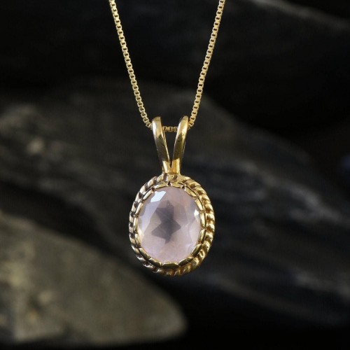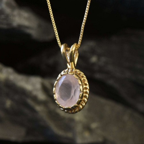 Gold Quartz Pendant set with a Natural Rose Quartz in a diamond cut & smoky pink color, at 10x8mm (3 Cts) from Brazil.