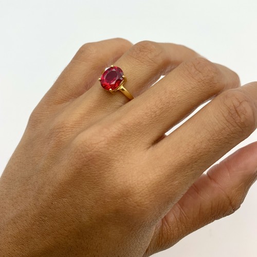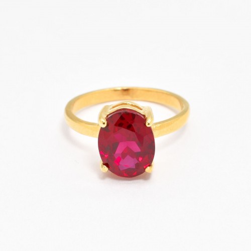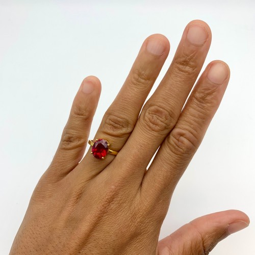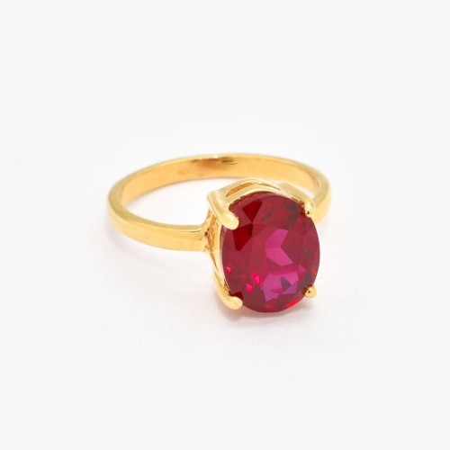 Gold Ruby Ring set with Created Ruby in a perfect diamond cut, flawless clarity & deep red color at 10x8mm (3 Cts).