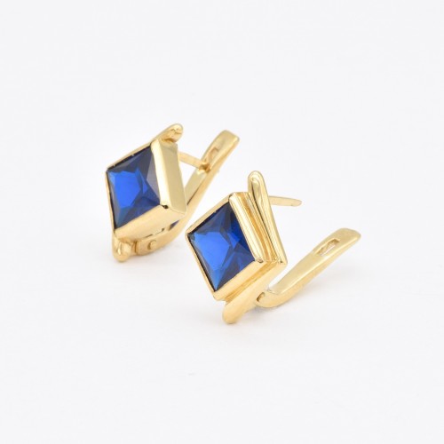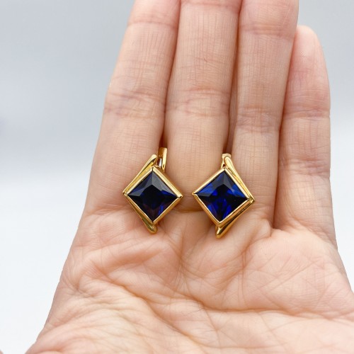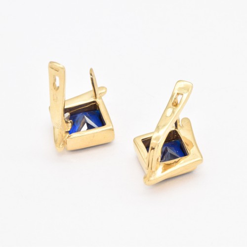 Gold Sapphire Earrings set with Created Sapphires in a flawless color & clarity, 8x8mm each (6 Cts a pair).