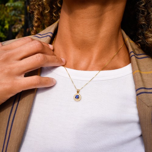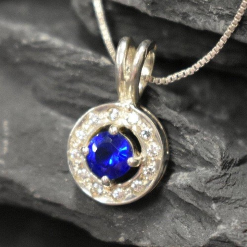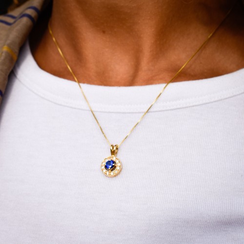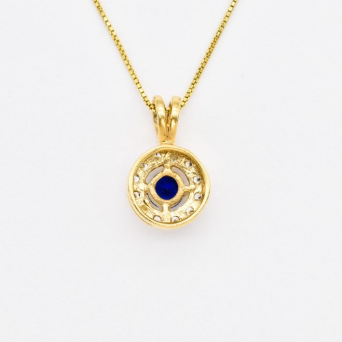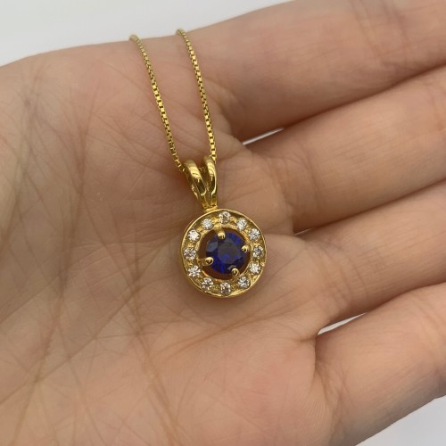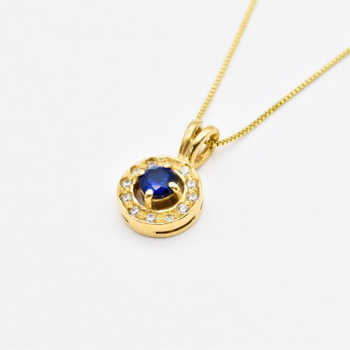 Gold Sapphire Pendant set with Created Sapphire in a flawless clarity, diamond cut & royal blue color, at 5mm (0.5 Cts) surrounded by CZ Diamonds.