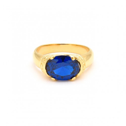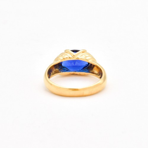 Gold Sapphire Ring set with Created Sapphire in a diamond cut & stunning blue color, at 10x8mm (3 Cts).