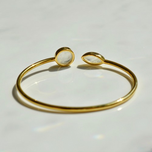 Connect to your inner light with this luminous gold vermeil bangle, featuring the ethereal beauty of faceted Rainbow Moonstone. Known for its mystical glow and divine feminine energy, Rainbow Moonstone encourages intuition, new beginnings, and emotional balance.