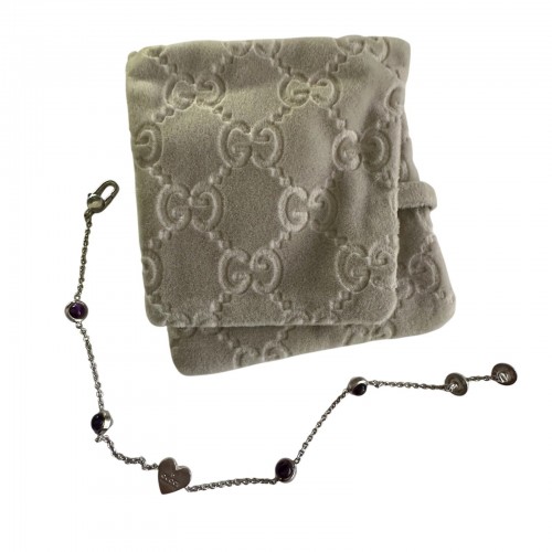 Gucci heart tag charm bracelet with purple amethyst gemstones. 925 Sterling silver.