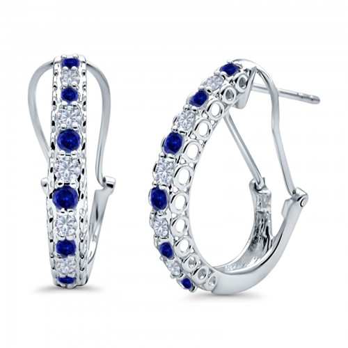 Half Eternity Huggie Hoop Earrings Round Simulated Blue Sapphire CZ 925 Sterling Silver (18mm)