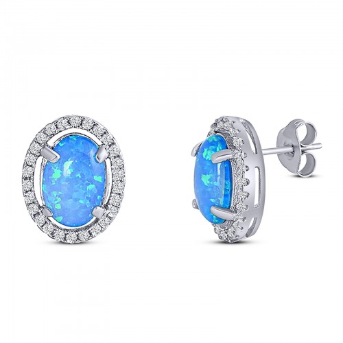 Halo Art Deco Oval Stud Earring Simulated Cubic Zirconia Created Blue Opal Solid 925 Sterling Silver (15mm)