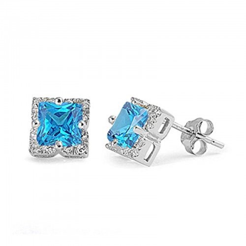 Halo Stud Earrings Wedding Princess Cut Simulated Blue Sapphire CZ Solid 925 Sterling Silver