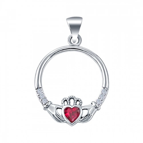 Heart Claddagh Charm Pendant Simulated Ruby CZ 925 Sterling Silver (21mm)